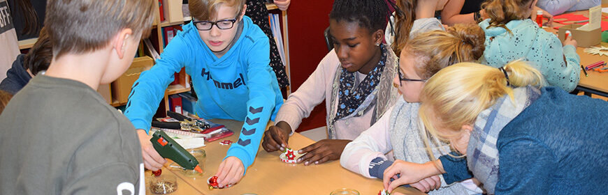 Beim diesjährigen Weihnachtsbasteln am vergangenen Freitag wurde im sechsten Jahrgang wieder fleißig gebastelt. Bei weihnachtlicher Musik und mit der Unterstützung einiger Eltern (vielen Dank!) entstand eine bunte Vielzahl an Tannenbaumschmuck, Fensterdekoration, selbstgedrehten Kerzen und weiteren adventlichen Verschönerungen. Beim Eintreten in den Jahrgang grüßt außerdem ab sofort eine große Tafel, auf der sich der gesamte Jahrgang mit kleinen Fingerabdruck-Motiven verewigen konnte.
