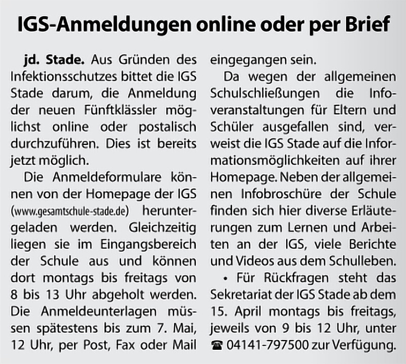 Das Wochenblatt berichtet über die Anmeldung der neuen Fünftklässer in Zeiten der Corona-Krise: