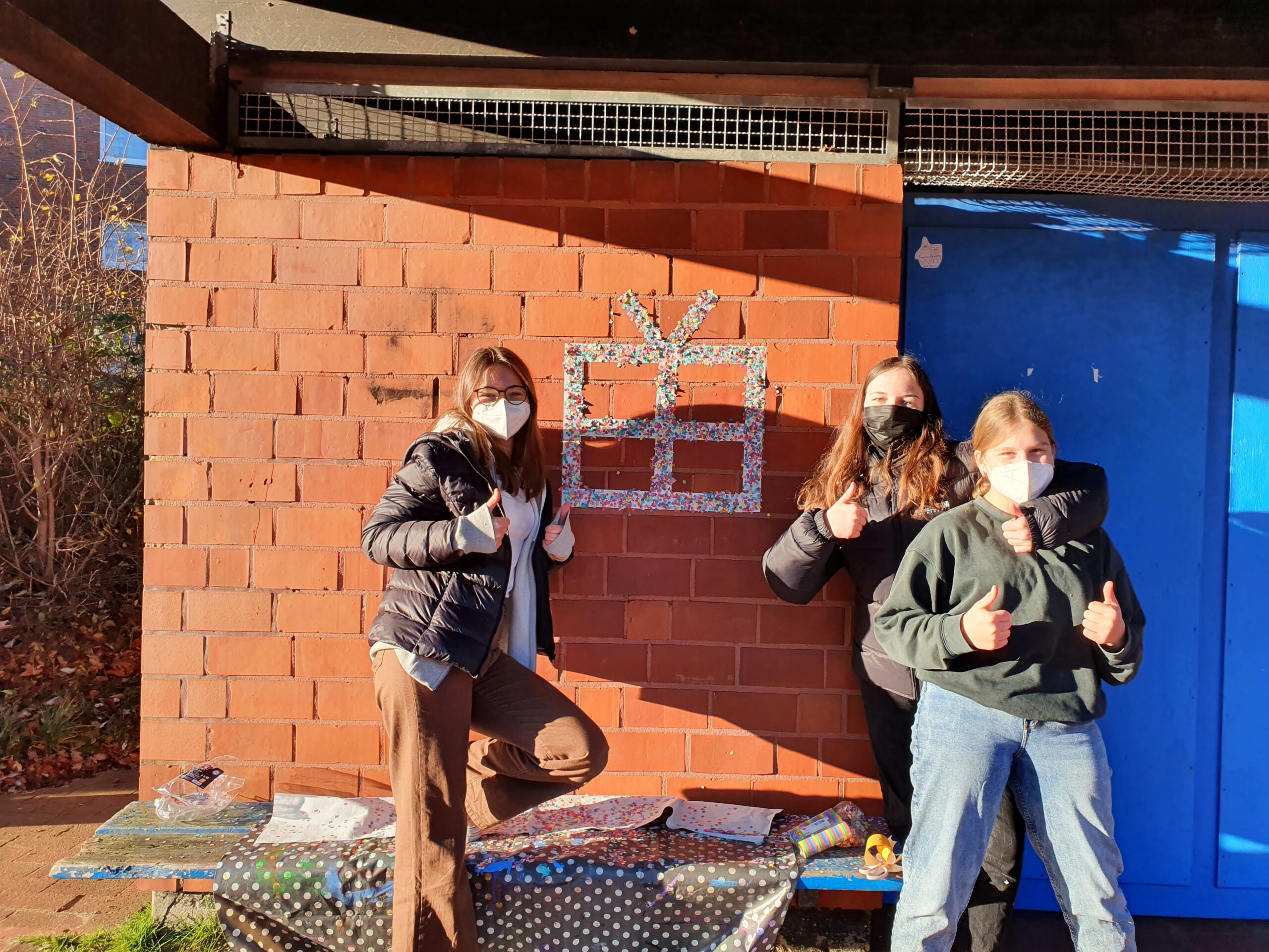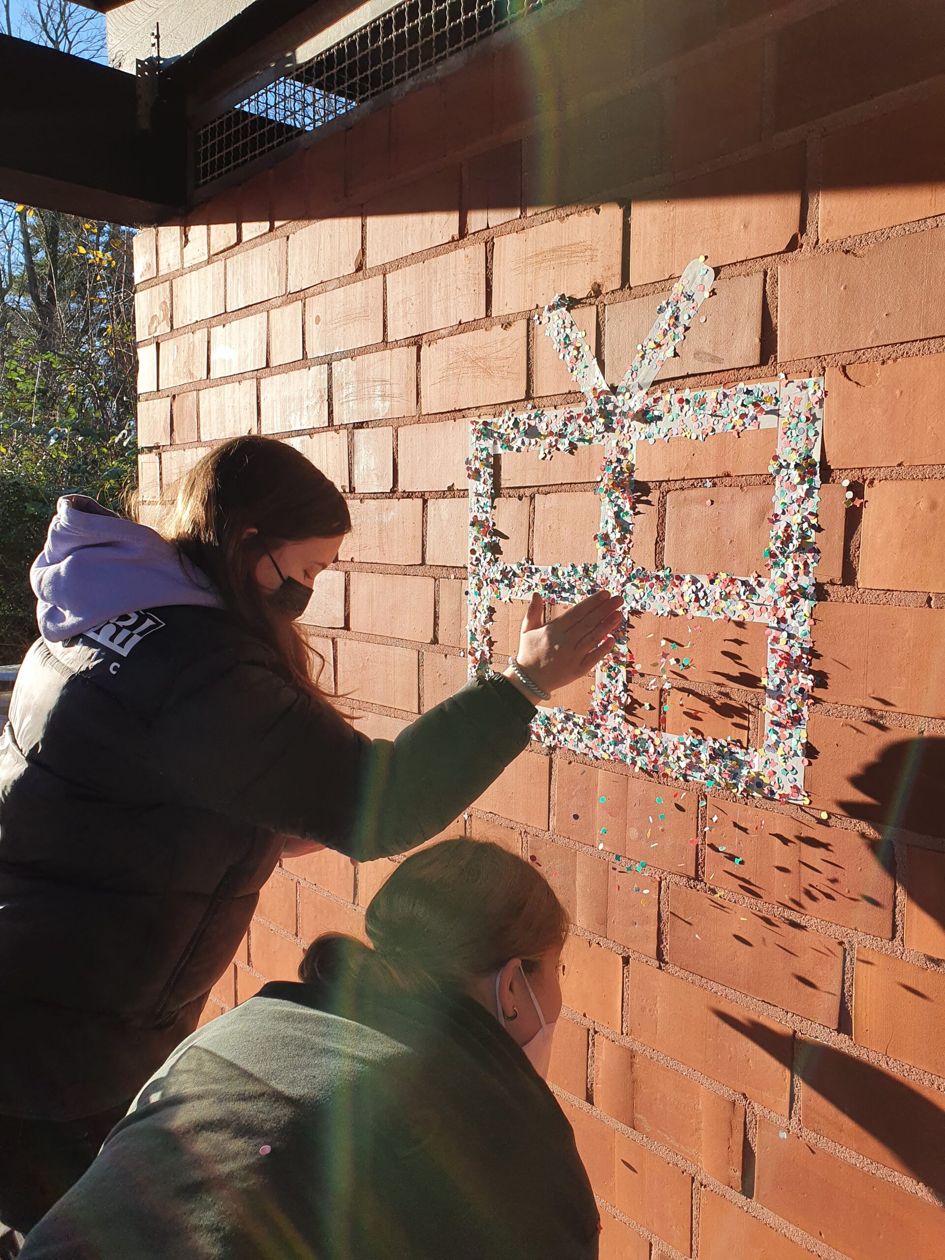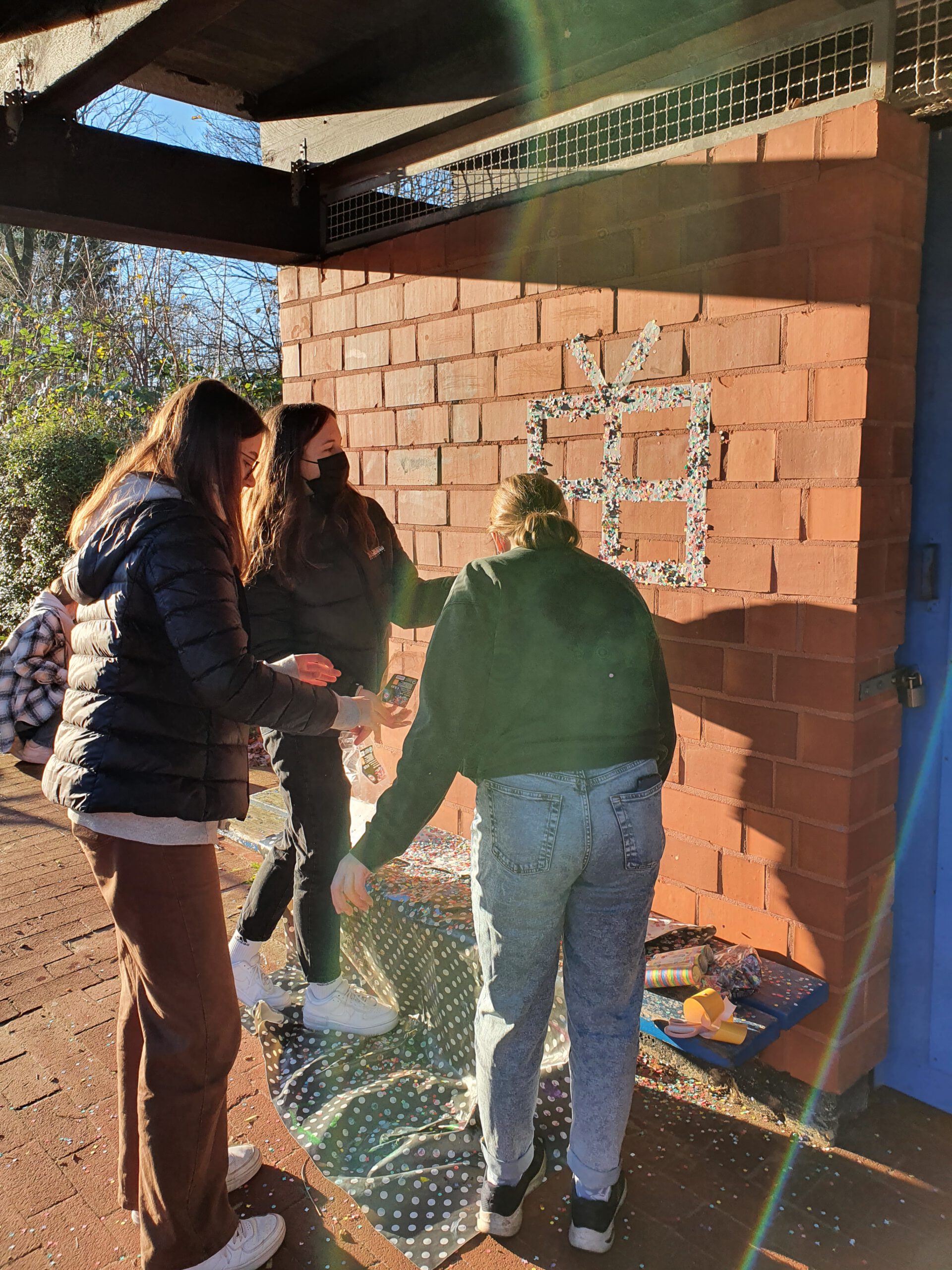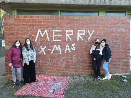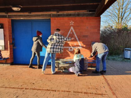 Der WPK Gestaltung aus dem 9. Jahrgang hat heute eine kleine Urban-Art-Aktion auf dem Pausenhof gestartet und weihnachtliche Konfettigrüße hinterlassen sowie seine Stickerkunst verbreitet.