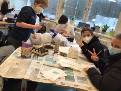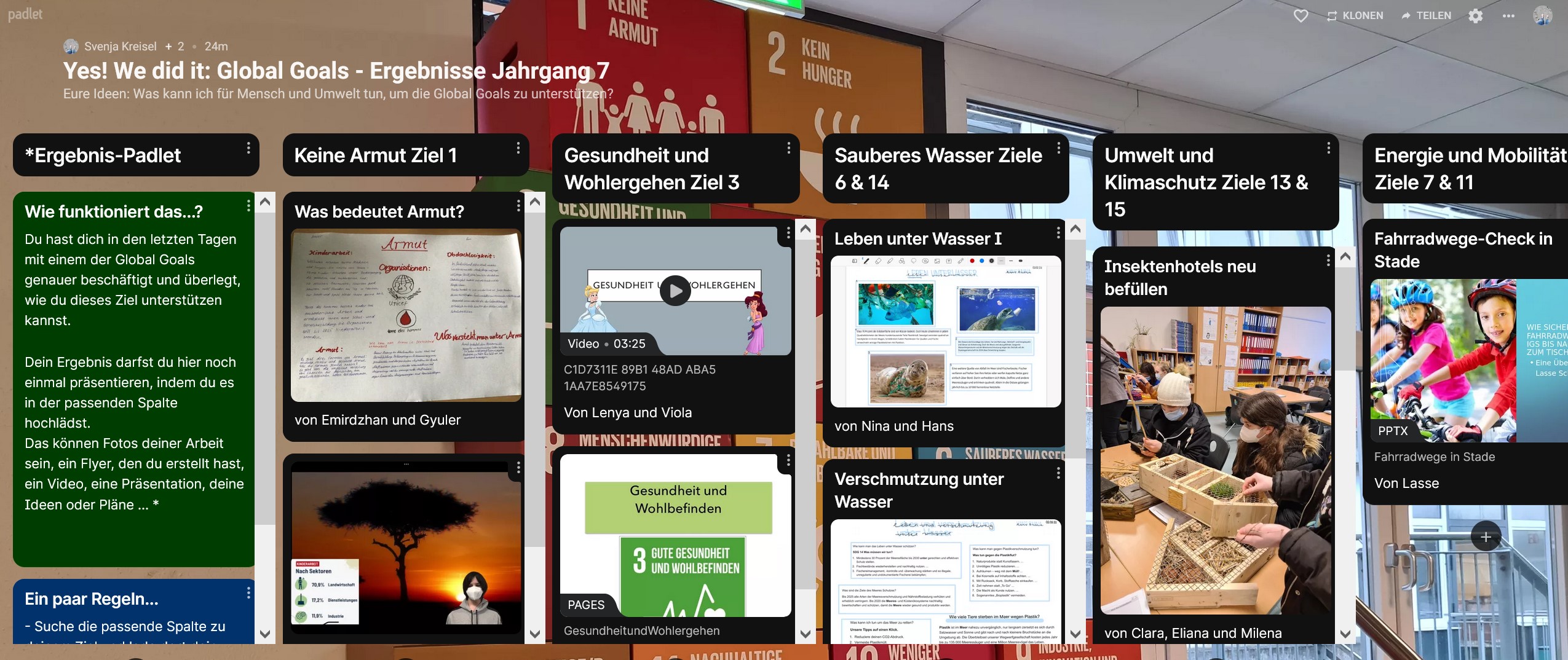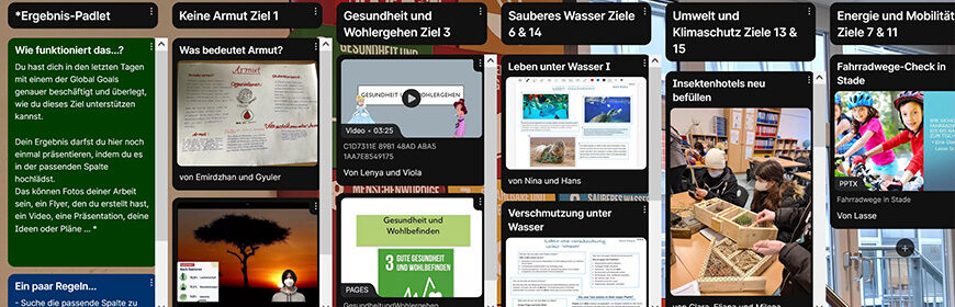 Alle fünf Klassen des Jahrgangs arbeiteten zusammen unter dem Motto „Was kann ich für Mensch und Umwelt tun, um die Global Goals zu unterstützen?“ in frei gewählten Gruppen und fast alles war als Projektergebnis erlaubt. Wir Lehrkräfte waren zwar die ganze Zeit dabei, aber eigentlich nur Begleiter, Beobachter und Unterstützer und immer wieder positiv überrascht über die Ideen und Umsetzungen zu den verschiedensten Zielen.