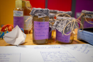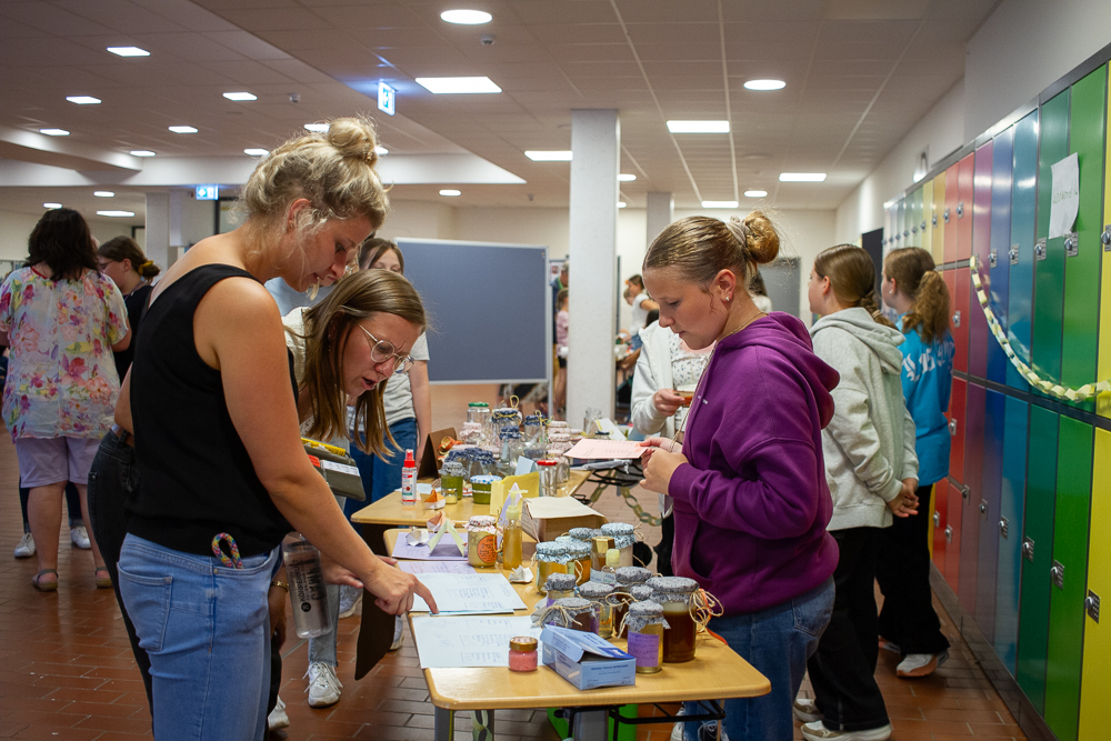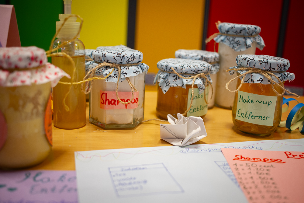Die Gruppe „Naturkosmetik“ stellt eigene Kosmetik her, wie zum Beispiel Gesichtswasser, eine Haarmaske, Lippenbalsam und vieles Weitere, was sie dann am Donnerstag verkaufen wollen. Die Materialien bringen alle aus der Gruppe mit und sie wollen mit dem Gewinn, den sie durch den Verkauf machen, die Materialkosten wieder ausgleichen.