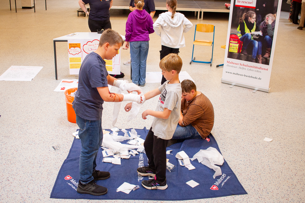 In der Projektwoche der IGS Stade drehen Kinder in der großen Sporthalle Fitnessvideos. Frau Wald und Frau Koch leiten das Ganze. Dabei kann es um Hampelmänner, Sprünge oder auch um das Seilspringen gehen und noch vieles mehr. Was genau die Schülerinnen und Schüler machen, seht ihr im Video: