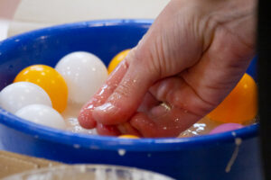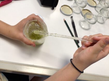 Wir waren bei de Gruppe „Seife ohne Plastik selber machen“ und wir waren erstaunt, wie leicht es ging, und es sah gut aus und hat gut gerochen. Die Seife wurde aus Fett (Raps- und Olivenöl, Kokosfett), Wasser, Natriumhydroxid und Natronlauge hergestellt.
