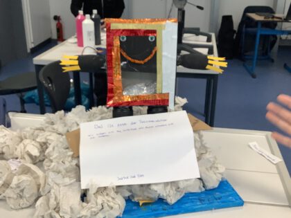 Wir waren beim Projekt „Kunst aus Müll“ und was wir dort gesehen haben, hat uns zum Staunen gebracht: Was man aus Müll alles machen kann! Wir haben gesehen, wie manche Schülerinnen und Schüler einen Roboter gebastelt haben und andere eine Figur aus dem gesammelten Müll.