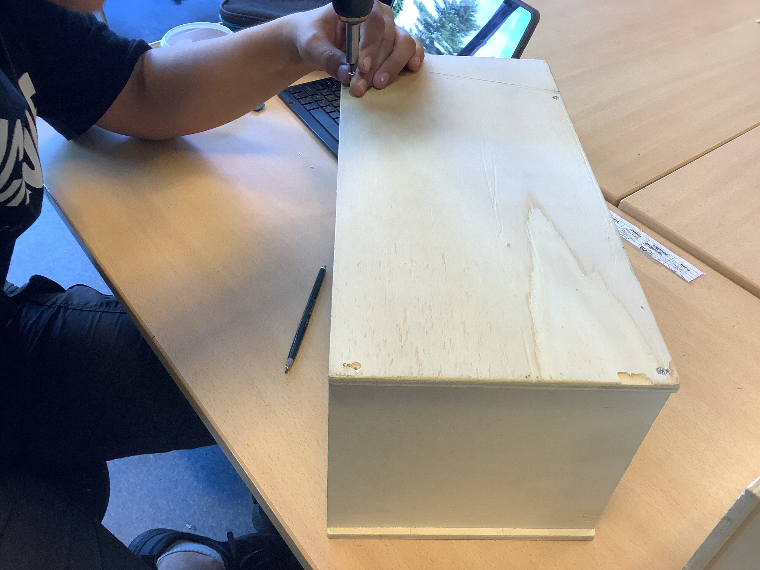 Am ersten Tag war die AG schon fleißig am werkeln, überall wurde gebaut, gesägt und geschliffen. Hier sieht man, wie jemand mit Fleiß an seinem Insektenhotel schraubt und ausmisst: