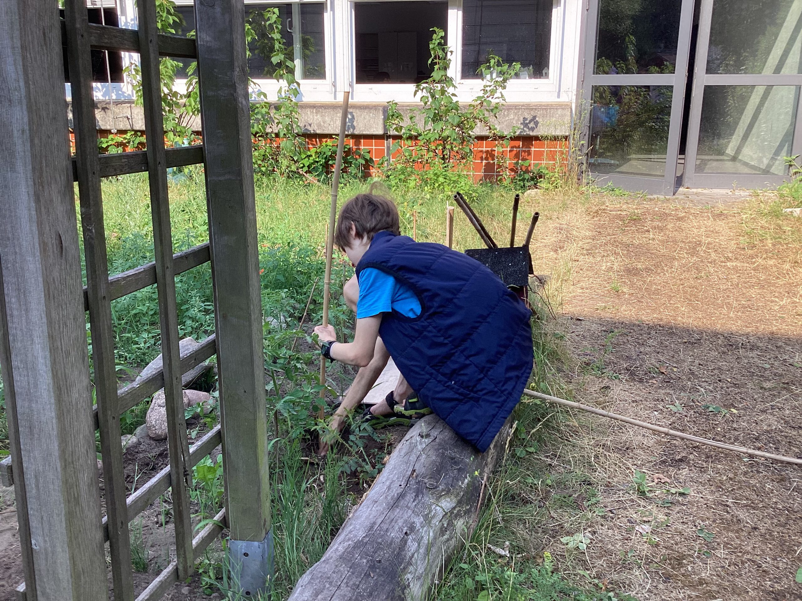 Im Schulgarten waren heute alle am Schuften, alle haben etwas gemacht. Der erste hakt das Beet, der nächste pflanzt Blumen und noch ein anderer kümmert sich um die Radieschen. Wir haben zwei Personen für ein Interview ausgesucht, die gerade Tomaten gepflanzt haben: