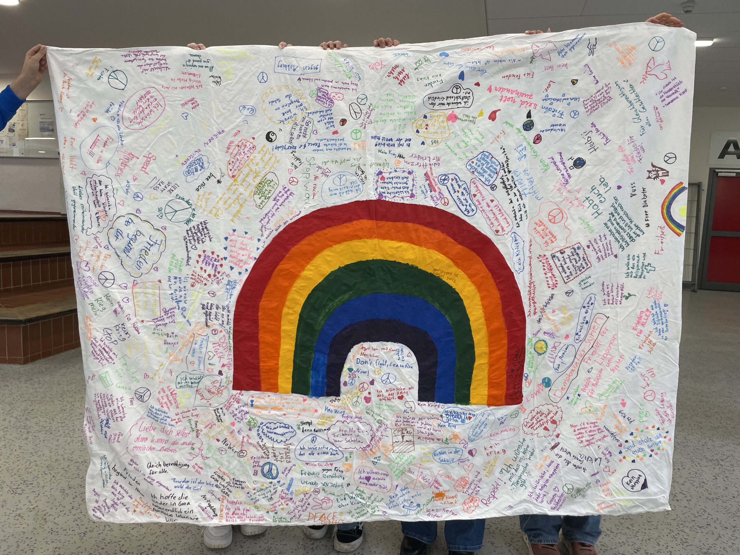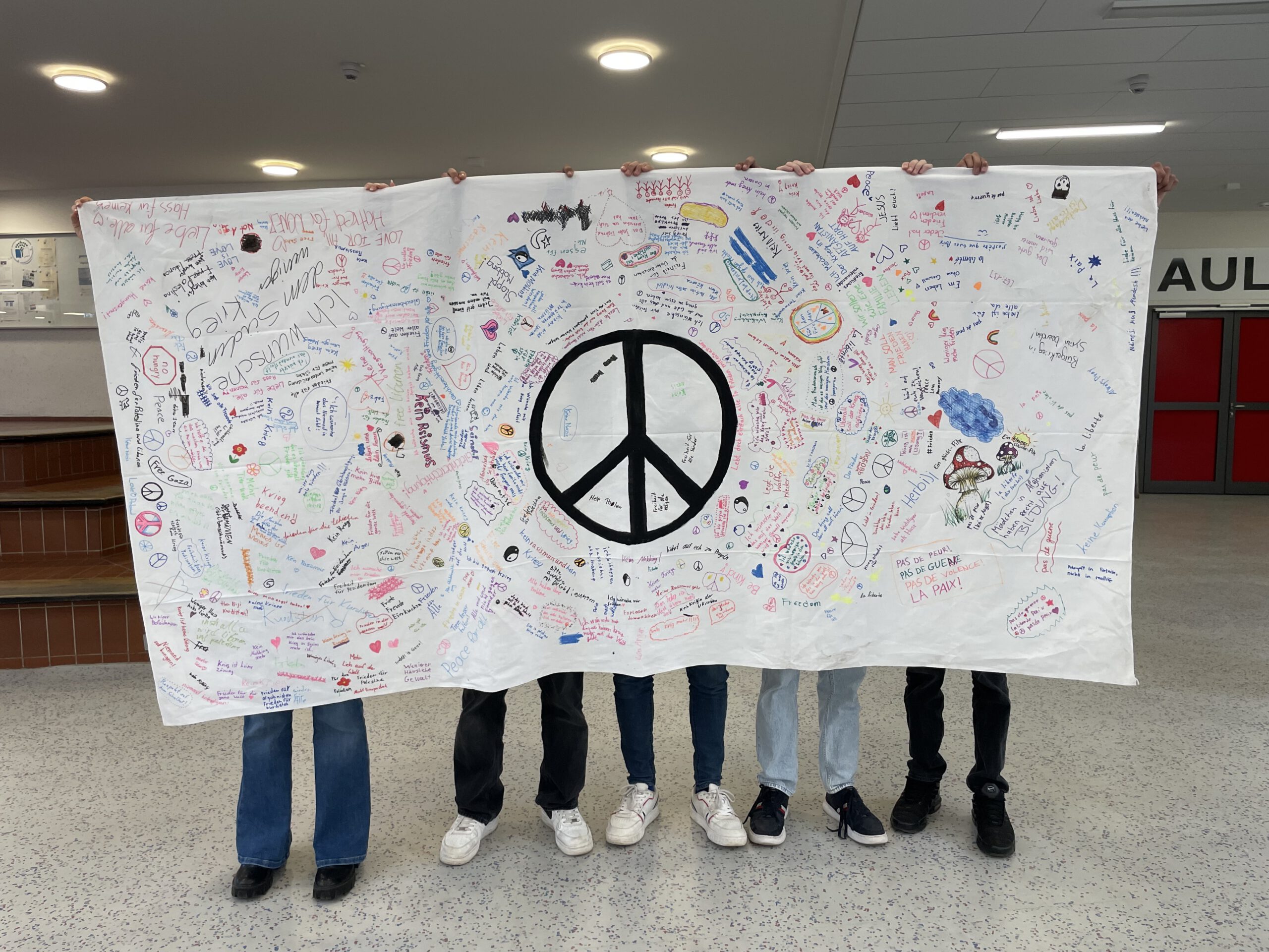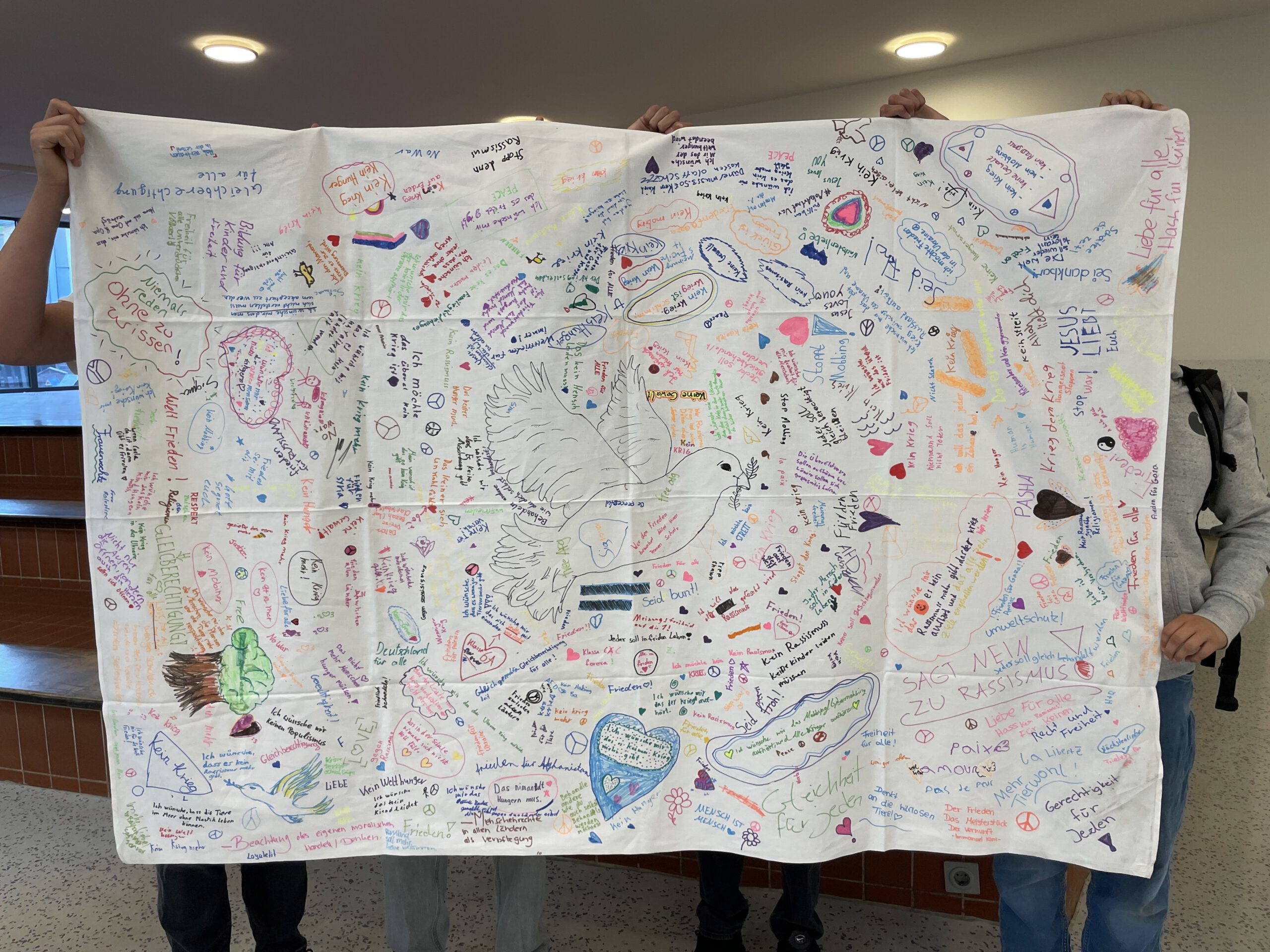 Die Wünsche, die auf den Bannern zu lesen sind, spiegeln eine breite Themenvielfalt wider. Während einige Schülerinnen und Schüler sich wünschten, „dass alle an unserer Schule aufeinander Rücksicht nehmen und sich jeder sicher fühlt“, äußerten andere den großen Wunsch, „dass der Krieg in der Ukraine endlich endet.“ Die Vielfalt der Wünsche zeigt, wie intensiv sich unsere Schülerschaft mit dem Thema Frieden auseinandersetzt – sei es im eigenen Umfeld oder im Hinblick auf globale Konflikte.