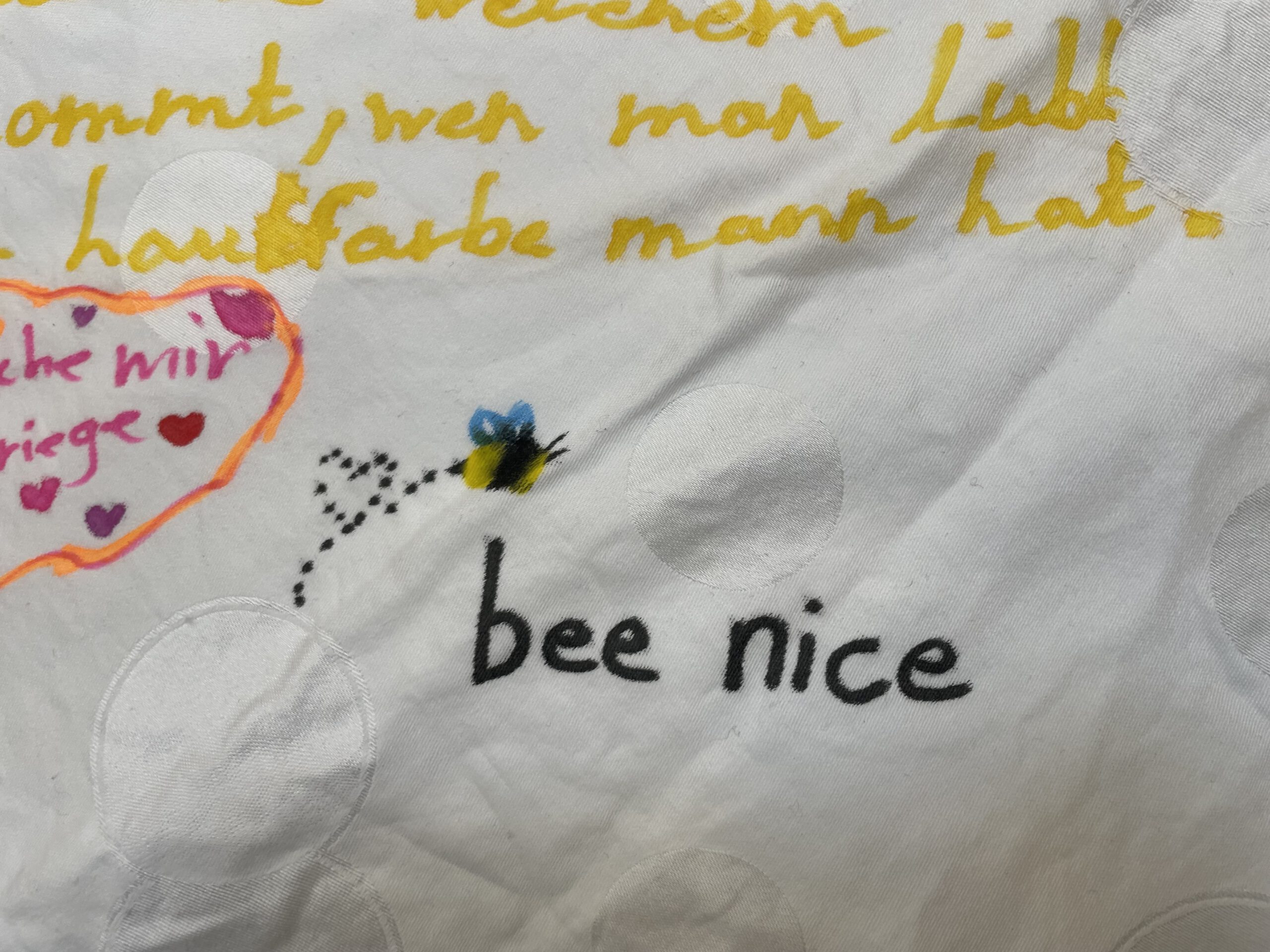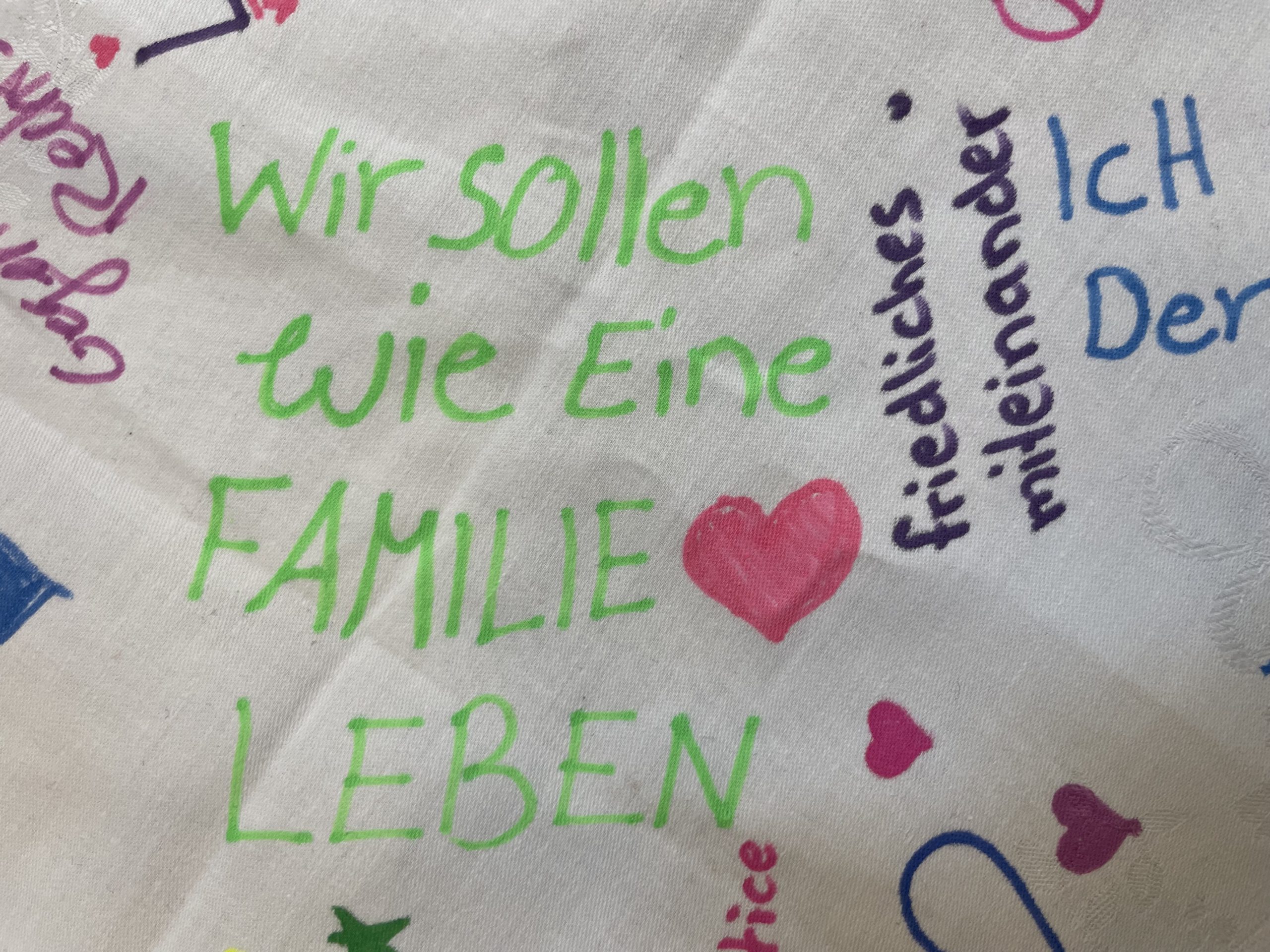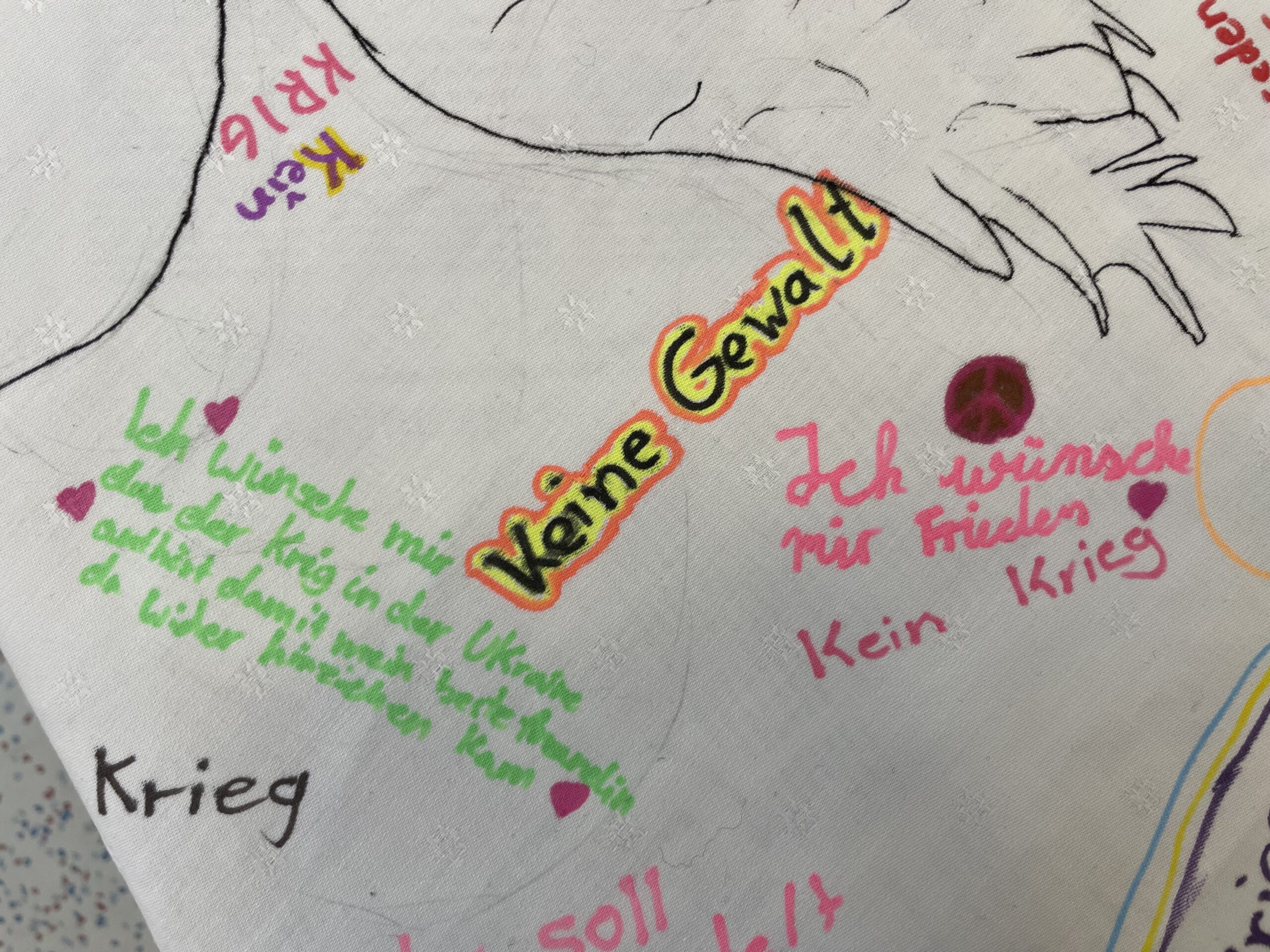 Die Wünsche, die auf den Bannern zu lesen sind, spiegeln eine breite Themenvielfalt wider. Während einige Schülerinnen und Schüler sich wünschten, „dass alle an unserer Schule aufeinander Rücksicht nehmen und sich jeder sicher fühlt“, äußerten andere den großen Wunsch, „dass der Krieg in der Ukraine endlich endet.“ Die Vielfalt der Wünsche zeigt, wie intensiv sich unsere Schülerschaft mit dem Thema Frieden auseinandersetzt – sei es im eigenen Umfeld oder im Hinblick auf globale Konflikte.