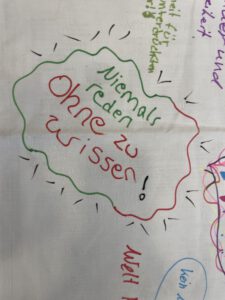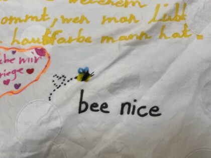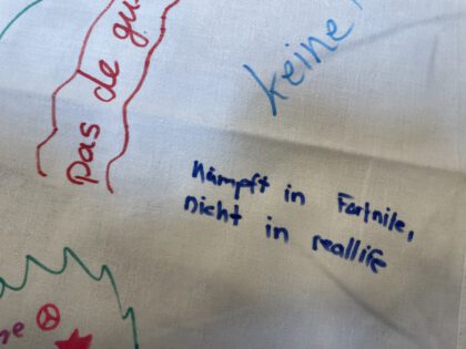 Die Aktion bot zudem die Gelegenheit, miteinander ins Gespräch zu kommen. Schülerinnen und Schüler diskutierten gemeinsam mit ihren Lehrkräften über die Bedeutung von Frieden und tauschten Ideen zur Gestaltung der Friedensflaggen aus. Diese Gespräche und die kreative Arbeit an den Bannern zeigen, wie groß das Engagement an unserer Schule für das Thema ist.