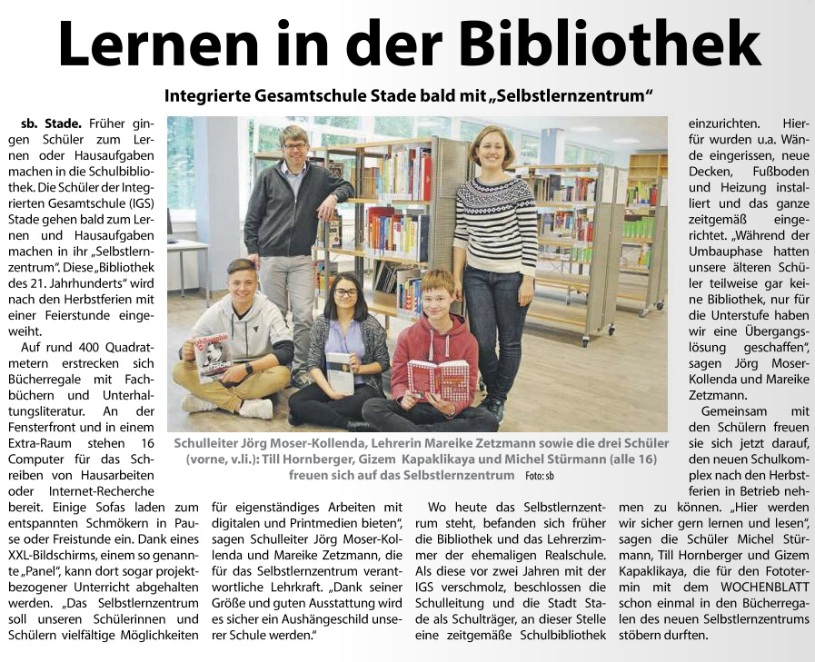 In ihrer Ausgabe vom 4. Oktober 2017 berichtet das Wochenblatt über unser Selbstlernzentrum, welches nach den Herbstferien feierlich eröffnet werden wird.