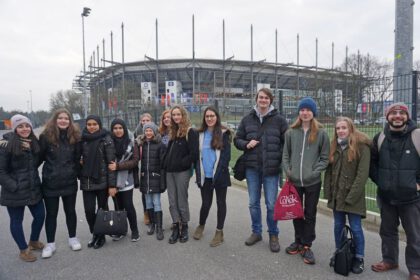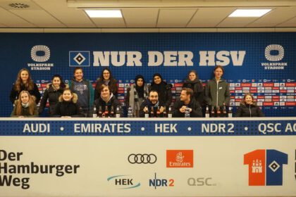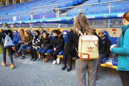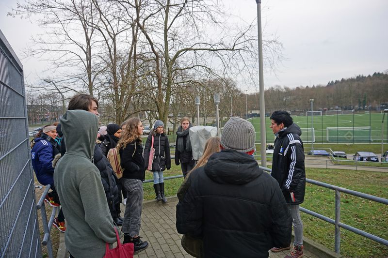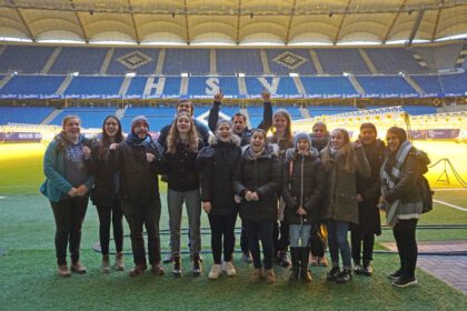 Am 19. Januar um kurz nach 8.00 Uhr trafen sich die AG „Schule ohne Rassismus“ und weitere Interessierte am Bahnhof, um in Richtung Hamburg zum Volksparkstadion, dem Zuhause des HSV, aufzubrechen. Nach der 1 1⁄2 stündigen Fahrt voller Vorfreude und dem Weg zum Stadion (und einmal ums Stadion rum) kamen wir um 10 Uhr am Nordosteingang an, wo schon Jana, der Guide vom HSV und Verena Klein, die uns den Tag über begleitete, auf uns warteten.