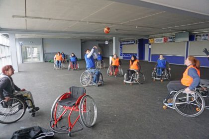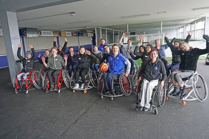 Bevor es in das warme Klassenzimmer ging, holten wir die für uns bereitgestellten Sportrollstühle ab. Im Klassenzimmer stellten sich die Rollstuhl-Basketballprofispieler der BG-Baskets Hamburg Karles Pochnieks und Vasily Kochetkov sowie Jana und Verena vor. Kurz danach ging es hoch in die Gänge des Stadions, wo wir genug Platz hatten, die Rollstühle mit kleinen Übungen sowie Slalom, den Ball prellen und werfen etc. kennenzulernen. Anfangs war es noch etwas ungewohnt, aber bald gelangen uns sogar einige Tricks. Wir teilten uns in zwei Mannschaften inklusive Lehrer, Jana und den Profis ein und spielten eine Runde Rollstuhl-Basketball.