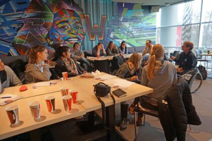 Nach der sportlichen Betätigung knurrte schon der Bauch und da kam die Mittagspause im ‚Klassenzimmer‘ wie gerufen. Gestärkt konnten wir im Anschluss Fragen an Verena stellen, die seit einem Unfall querschnittsgelähmt und somit an den Rollstuhl gebunden ist. Sie testete auch unser Vorwissen sowie Vorstellungen von dem Alltag mit Rollstuhl. Früher war sie einmal eine Profi-Spielerin der BG-Baskets und der Rollstuhl-Basketball Nationalmannschaft. Mit Witzen aber auch ernsten Worten nahm sie uns die Angst, wie es sein könnte, wenn man durch einen Unfall im Rollstuhl sitzt. Mit den Worten „Schicksal kannst du dir nicht aussuchen, Schicksal kannst du beeinflussen“, berührte sie viele von uns.