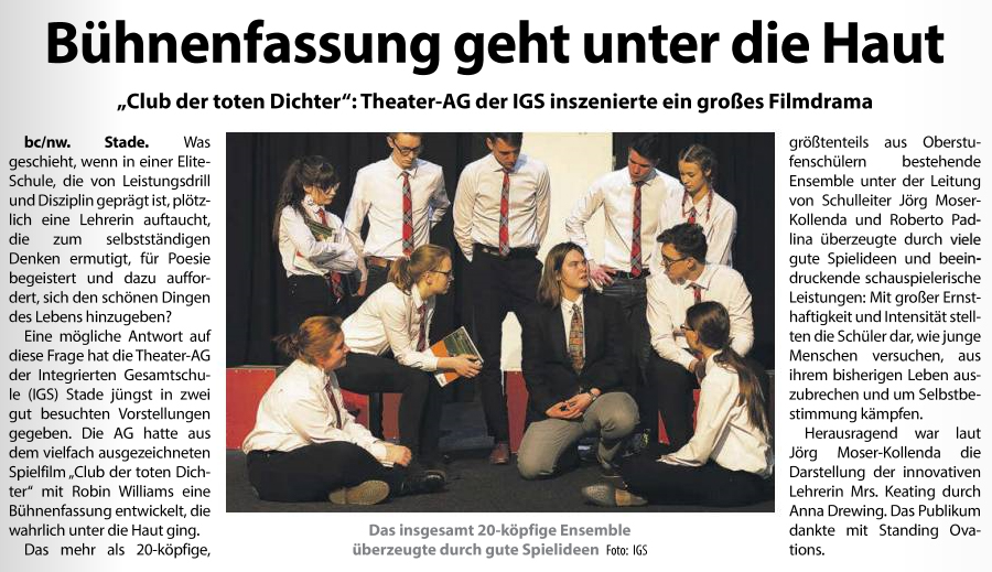 In ihrer Ausgabe vom 14.03.2018 berichtet die Kreiszeitung Wochenblatt von der Theateraufführung der Theater-AG der IGS am 8. und 9. März: