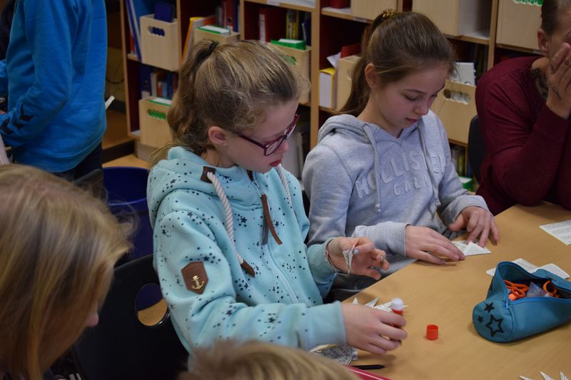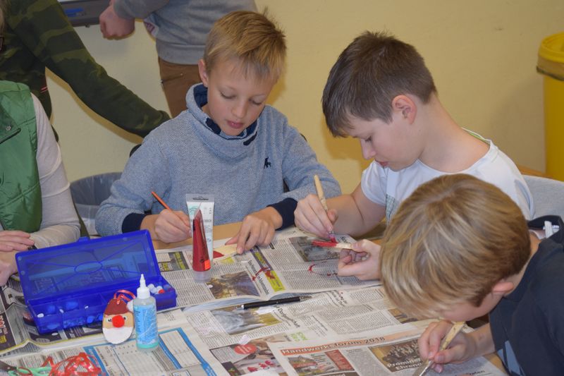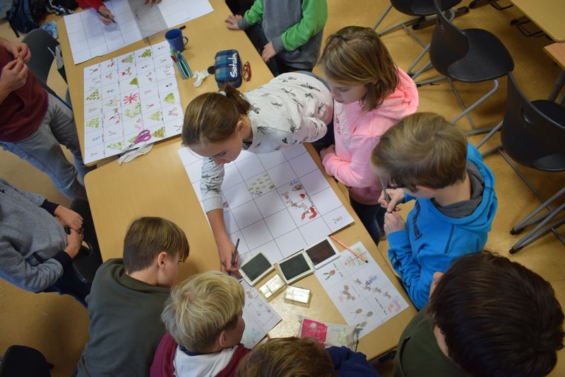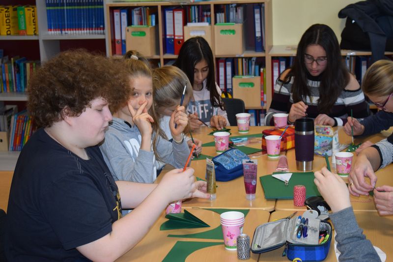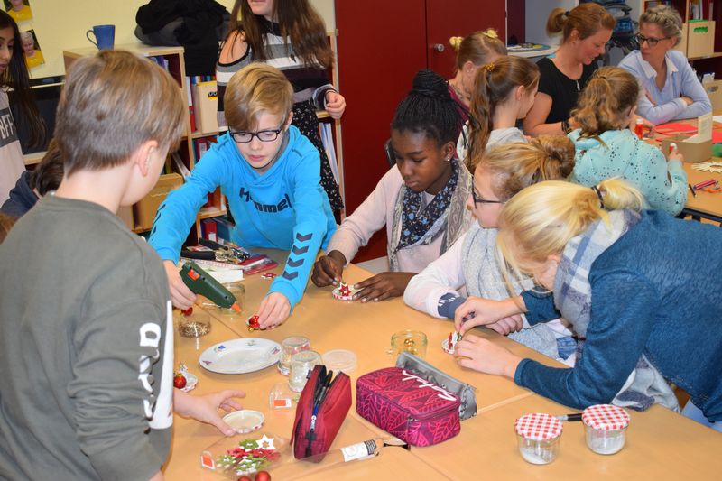 Beim diesjährigen Weihnachtsbasteln am vergangenen Freitag wurde im sechsten Jahrgang wieder fleißig gebastelt. Bei weihnachtlicher Musik und mit der Unterstützung einiger Eltern (vielen Dank!) entstand eine bunte Vielzahl an Tannenbaumschmuck, Fensterdekoration, selbstgedrehten Kerzen und weiteren adventlichen Verschönerungen. Beim Eintreten in den Jahrgang grüßt außerdem ab sofort eine große Tafel, auf der sich der gesamte Jahrgang mit kleinen Fingerabdruck-Motiven verewigen konnte. Natürlich durfte das obligatorische Weihnachtsbuffet nicht fehlen, bei dem wieder mal sensationell aufgetischt wurde und in diesem Jahr stand auch ein Spieleraum zur Verfügung, der zum netten Beisammensein einlud. So entstand eine gemütliche Stimmung und ein jeder kam auf seine Kosten.