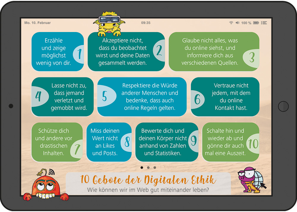 Kritische Medienerziehung ist ein ganz wesentlicher Bestandteil unseres Unterrichts. Uns ist wichtig, dass sich unsere Schüler*innen für ein gutes Miteinander auch in der digitalen Kommunikation einsetzen. Die „10 Gebote der digitalen Ethik“ sind ein guter Ausgangspunkt: