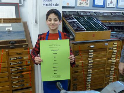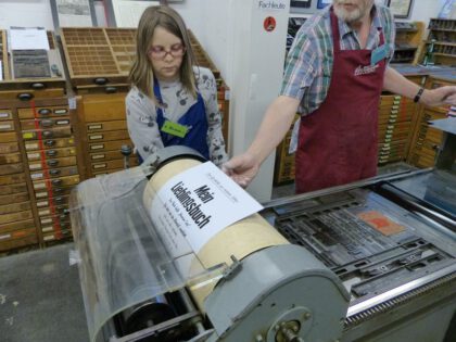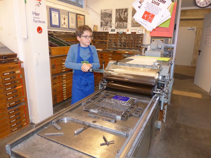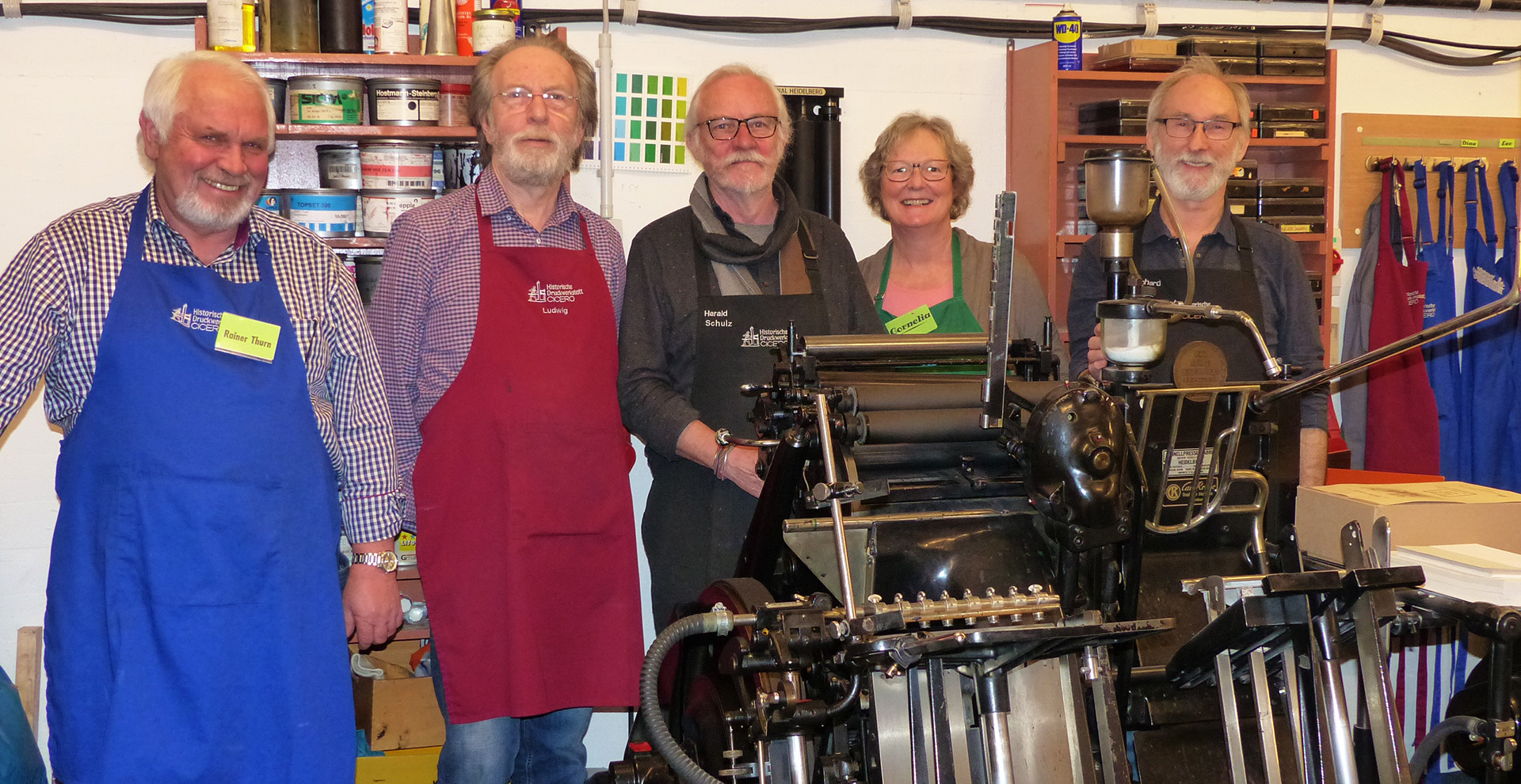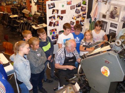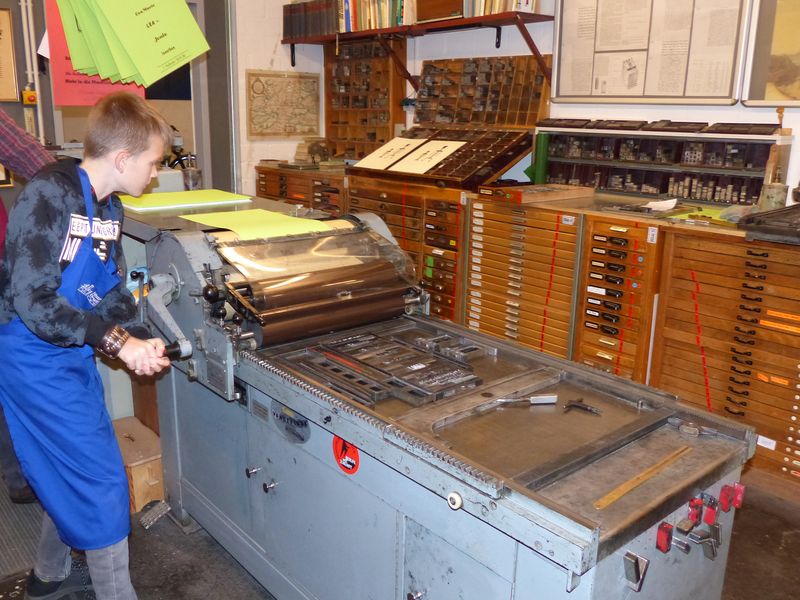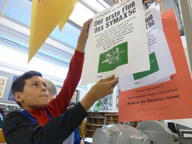 Um aber diese alte Satz- und Druck-Technik nicht in Vergessenheit geraten zu lassen, wurde ein Teil der G+J‑Setzerei von einigen Setzer-Kollegen günstig aufgekauft. Nach einigen Umzügen fand diese alte Druckerei dann im Stader Technik- und Verkehrsmuseum eine neue Heimat. Schriftregale und Maschinen aus diversen Stader Druckerei-Betrieben kamen dann immer wieder als Stiftungen dazu. Darunter auch aus den Druckerei Hesse oder der Fa. Waller in Stade. Niemand mochte diese alte, aber in Jahrhunderten bewährte Technik einfach vernichten, sondern man wollte sie erhalten wissen. Nach dem „Aus“ des Technik- u. Verkehrsmuseums ermöglichten uns dann die Hansestadt Stade und die IGS, im Schulkeller im Jahr 2013 ein neues Zuhause zu finden. Anfang 2014 starteten dann die ersten Nachmittags-„Neigungskurse“ in der IGS.