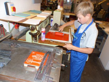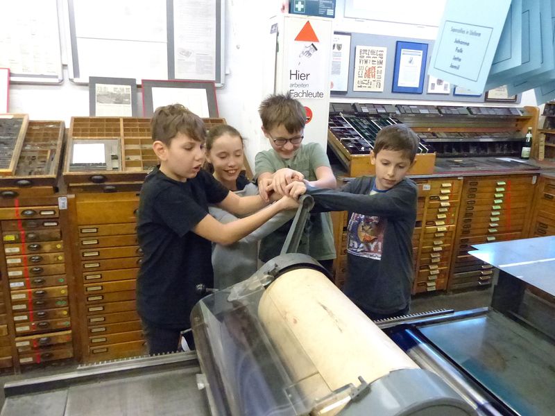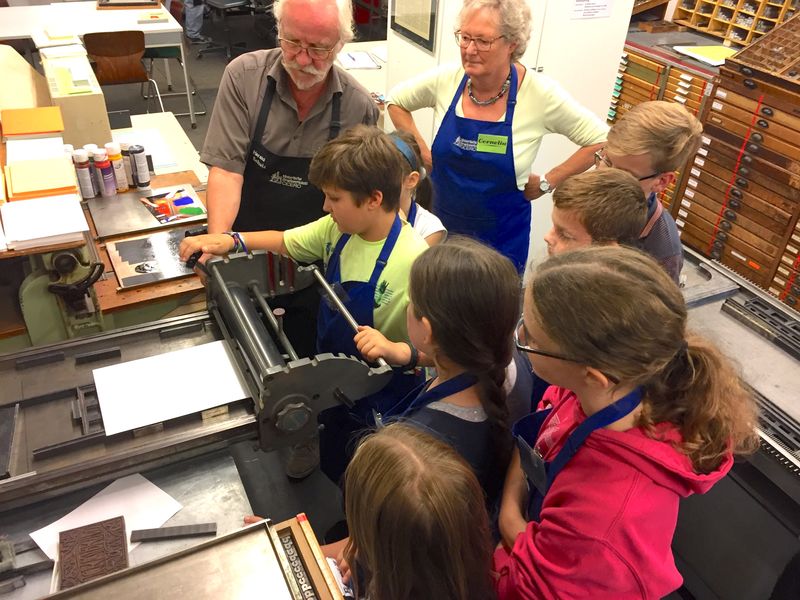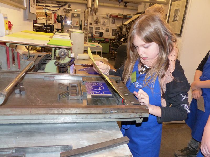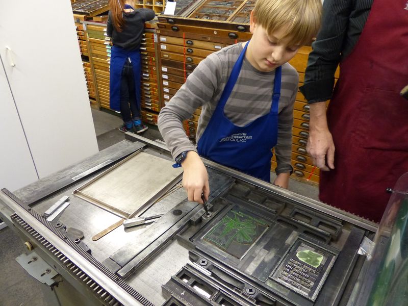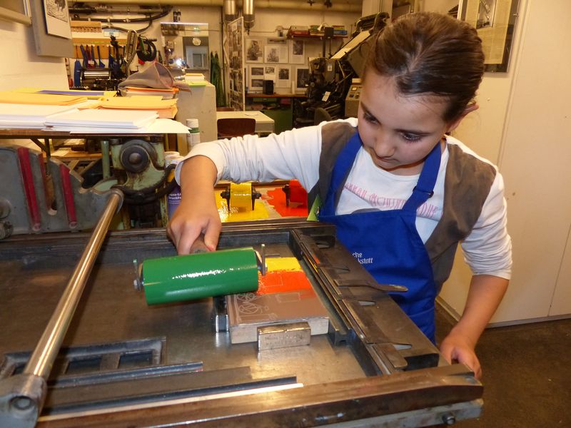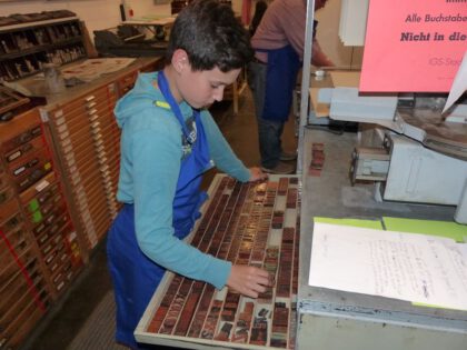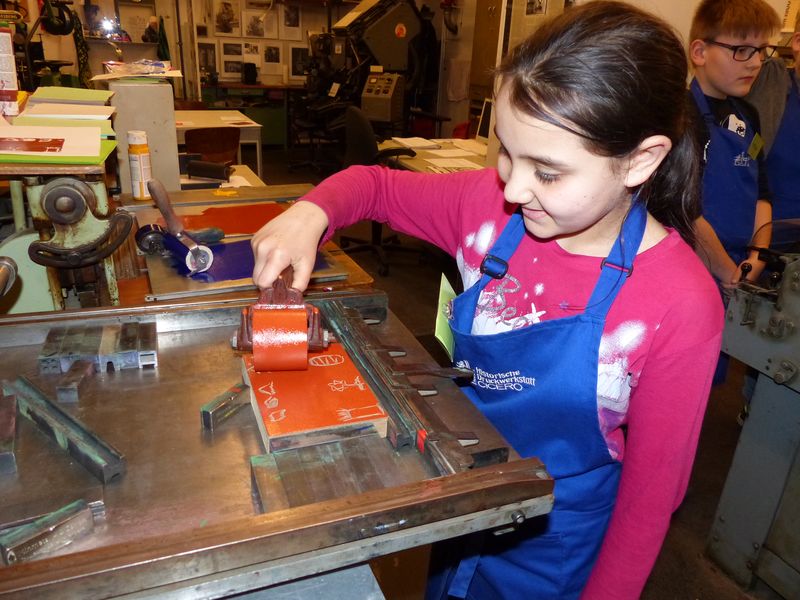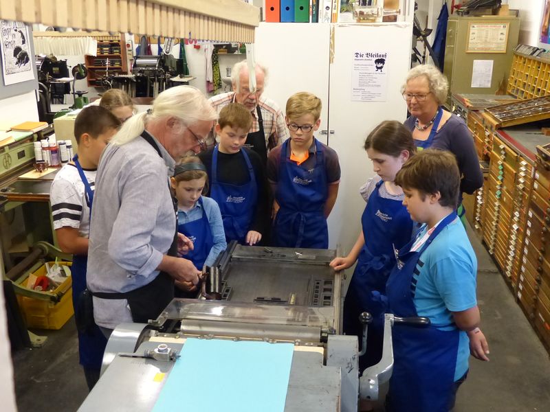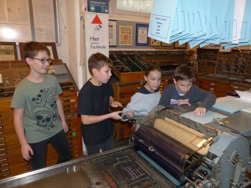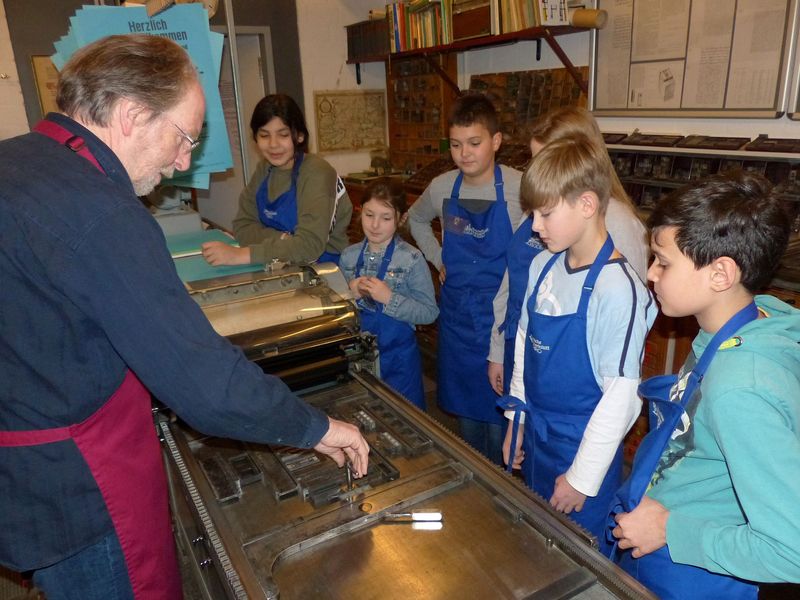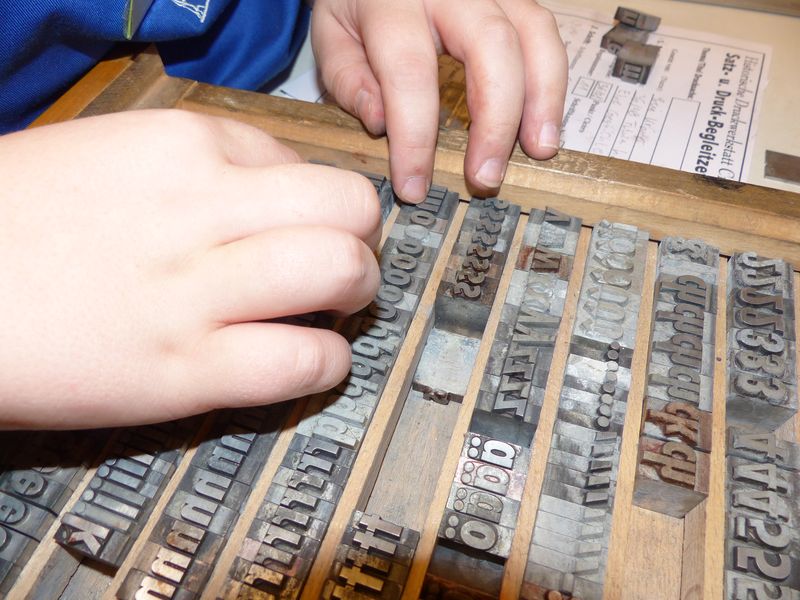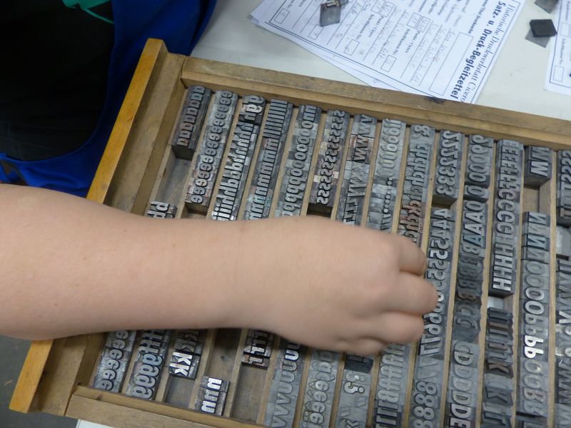 Im Mittelpunkt unserer Arbeit mit den Kindern in unserer „Historischen Druckwerkstatt“ soll darum das eigenhändige Erstellen und Verarbeiten von Texten und Bildern sowie das Erleben des Druckvorgangs mit seinen notwendigen Vorstufen stehen. Unter fachkundiger Anleitung wollen wir den Schülern die Möglichkeit geben, ihre Ideen mit Blei‑, Kunststoff- und Holzbuchstaben sowie Linolschnitten in selbst geschaffene Druckerzeugnisse umzusetzen und zu Papier zu bringen.