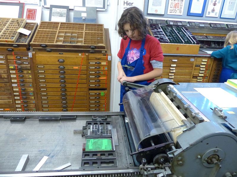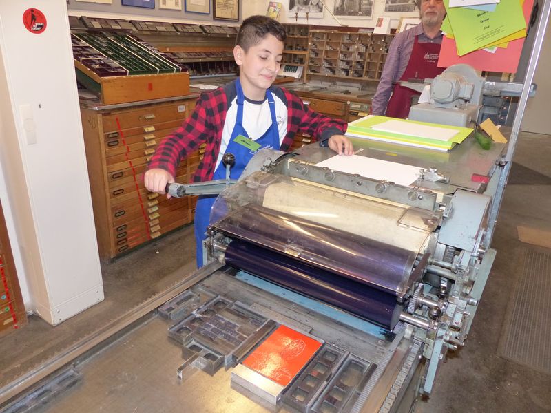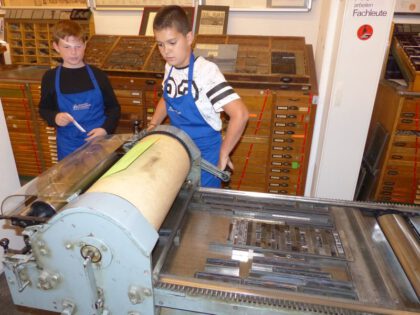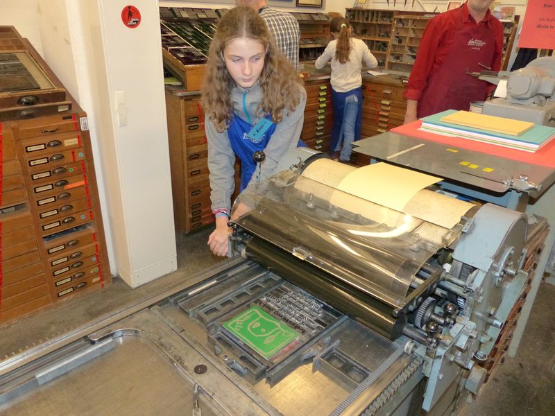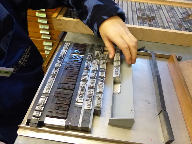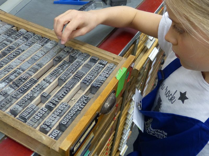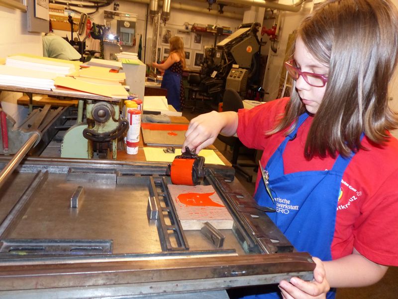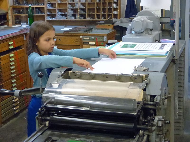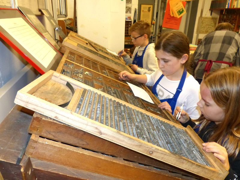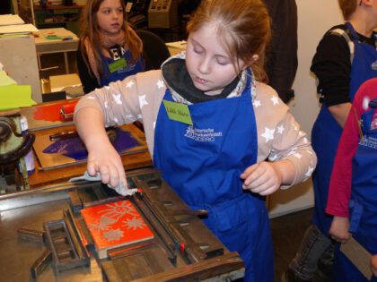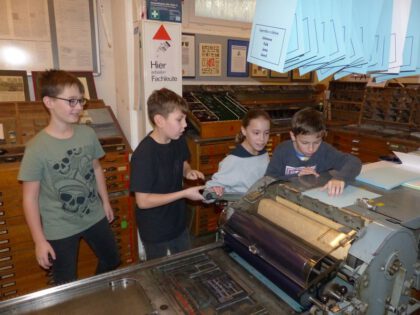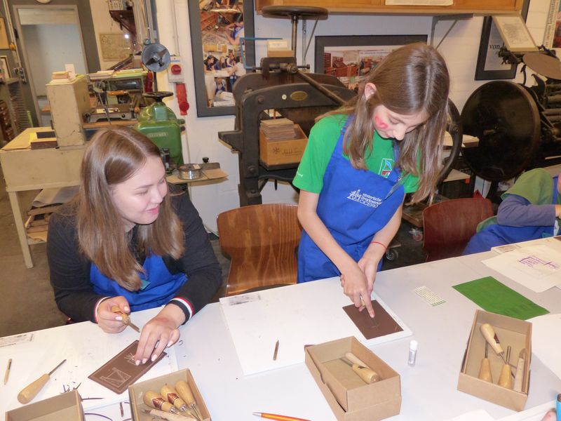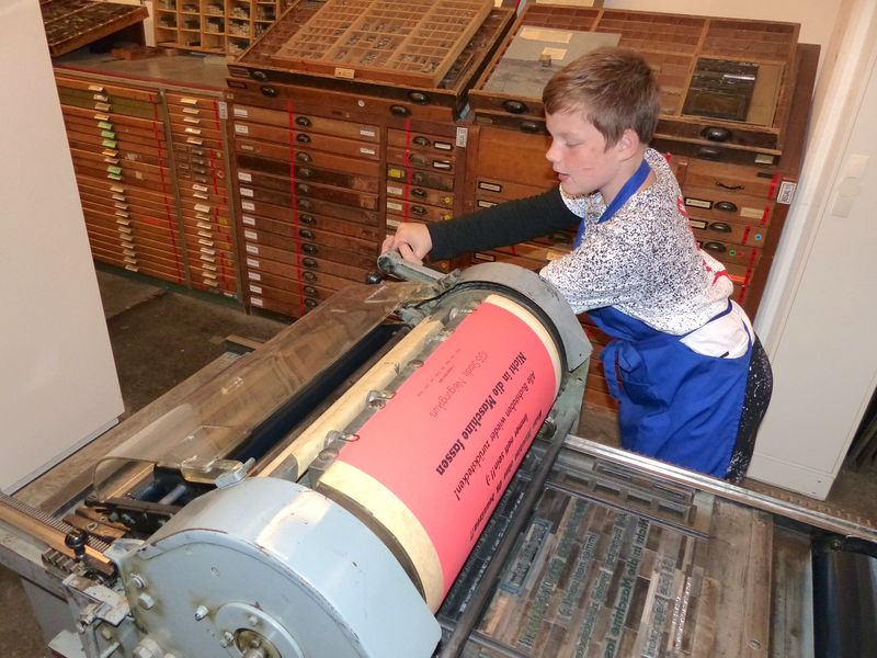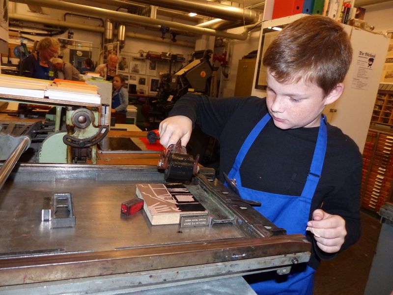 Im Mittelpunkt unserer Arbeit mit den Kindern in unserer „Historischen Druckwerkstatt“ soll darum das eigenhändige Erstellen und Verarbeiten von Texten und Bildern sowie das Erleben des Druckvorgangs mit seinen notwendigen Vorstufen stehen. Unter fachkundiger Anleitung wollen wir den Schülern die Möglichkeit geben, ihre Ideen mit Blei‑, Kunststoff- und Holzbuchstaben sowie Linolschnitten in selbst geschaffene Druckerzeugnisse umzusetzen und zu Papier zu bringen.