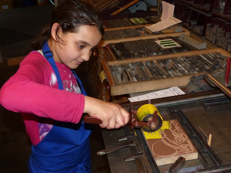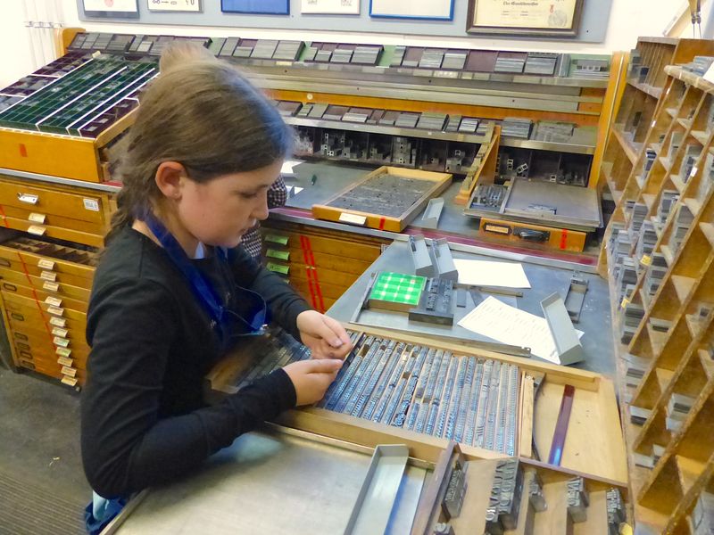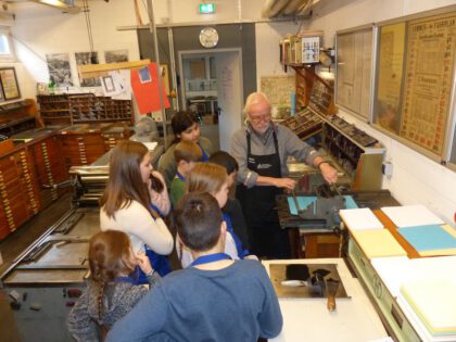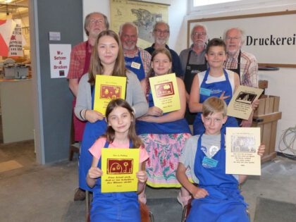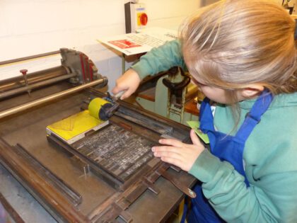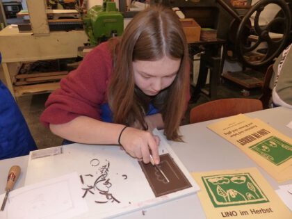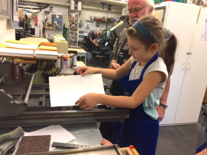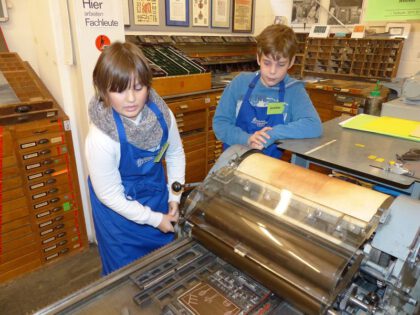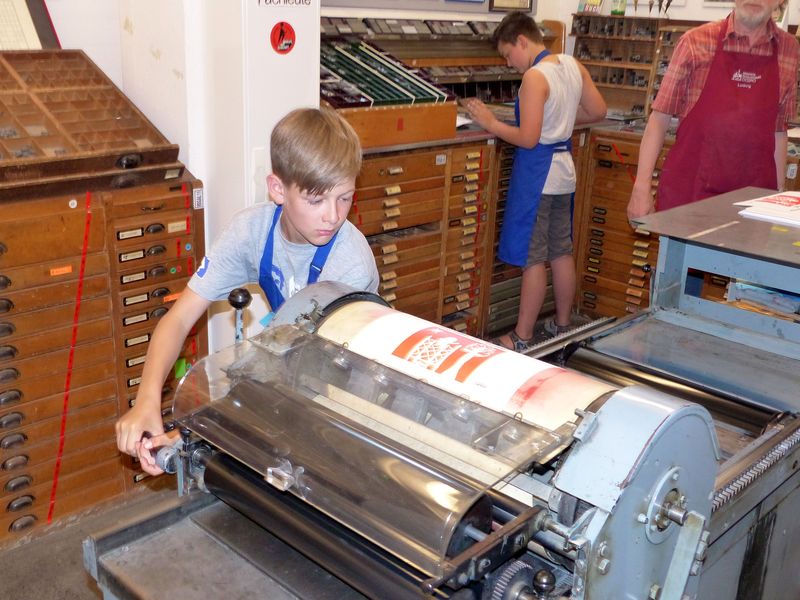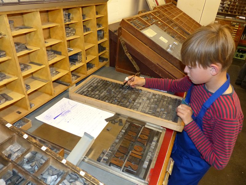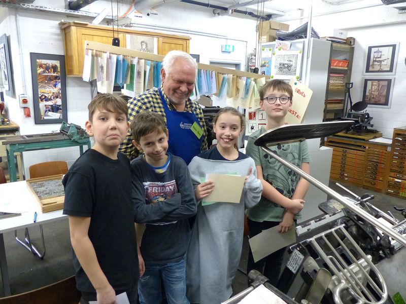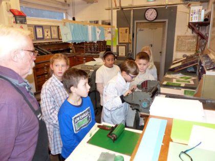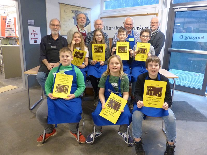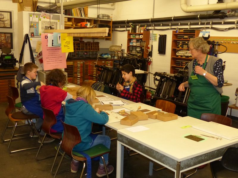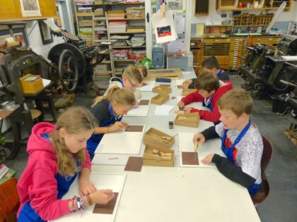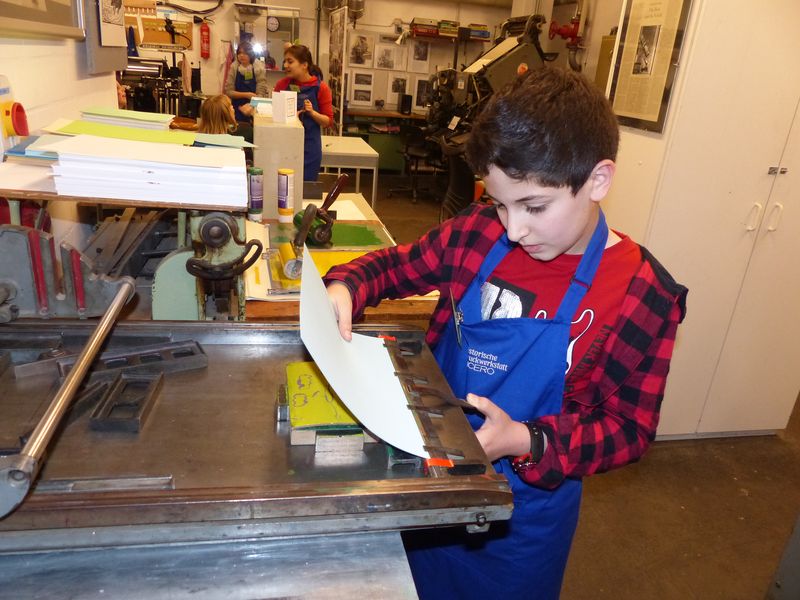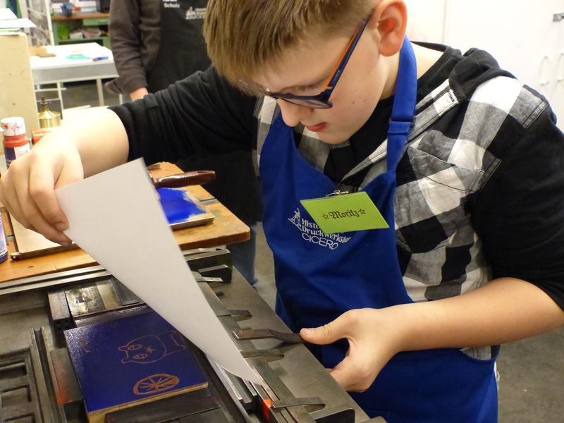 Im Mittelpunkt unserer Arbeit mit den Kindern in unserer „Historischen Druckwerkstatt“ soll darum das eigenhändige Erstellen und Verarbeiten von Texten und Bildern sowie das Erleben des Druckvorgangs mit seinen notwendigen Vorstufen stehen. Unter fachkundiger Anleitung wollen wir den Schülern die Möglichkeit geben, ihre Ideen mit Blei‑, Kunststoff- und Holzbuchstaben sowie Linolschnitten in selbst geschaffene Druckerzeugnisse umzusetzen und zu Papier zu bringen.